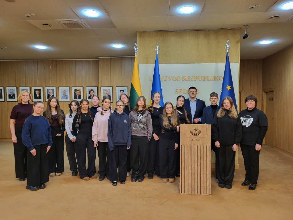 Sausio 7 dieną VI klasės mokinės Ariana Jurgo ir Jolita Seniut kartu su dailės mokytoja Ivona Dakinevič dalyvavo nacionalinio piešinių konkurso „Mes užaugome laisvi“, skirto Laisvės gynėjų dienai, parodos atidaryme. Šiame konkurse mokinės dalyvavo rudenį. Konkursą organizavo Vilniaus Karoliniškių muzikos mokykla ir Dailės mokytojų asociacija. Parodos atidarymo metu renginį papuošė gražus mokinių muzikinis pasirodymas. Viešnagės Seime metu taip pat vyko išskirtinė ekskursija, kurią vedė Seimo narys Vytautas Sinica. Tai buvo turininga diena, palikusi gražius įspūdžius visiems dalyviams. ![]()